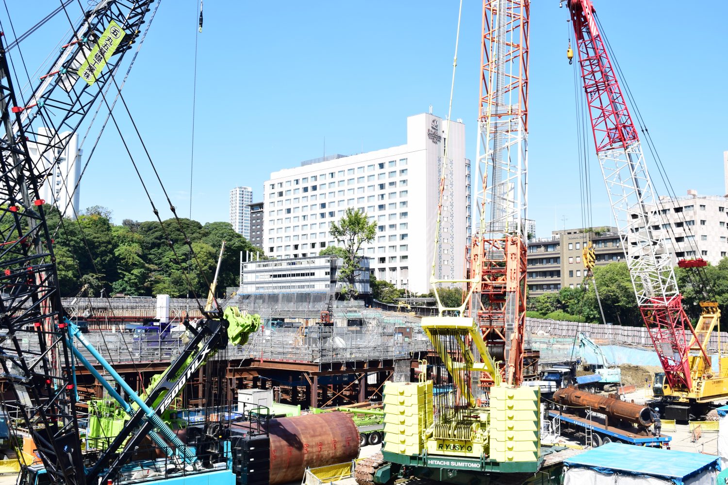 先月に引き続き、品川駅前の歩道橋から旧シナガワグース跡地を撮影しました。敷地内に置かれた鉄骨の量が7月時点より少なくなっており、ショベルカーやクレーンが活発に稼働していました。敷地の上部では複数のトラックが資材や建設機械を搬出入しており、多くの作業員によって工事が着々と進められている様子がうかがえます。