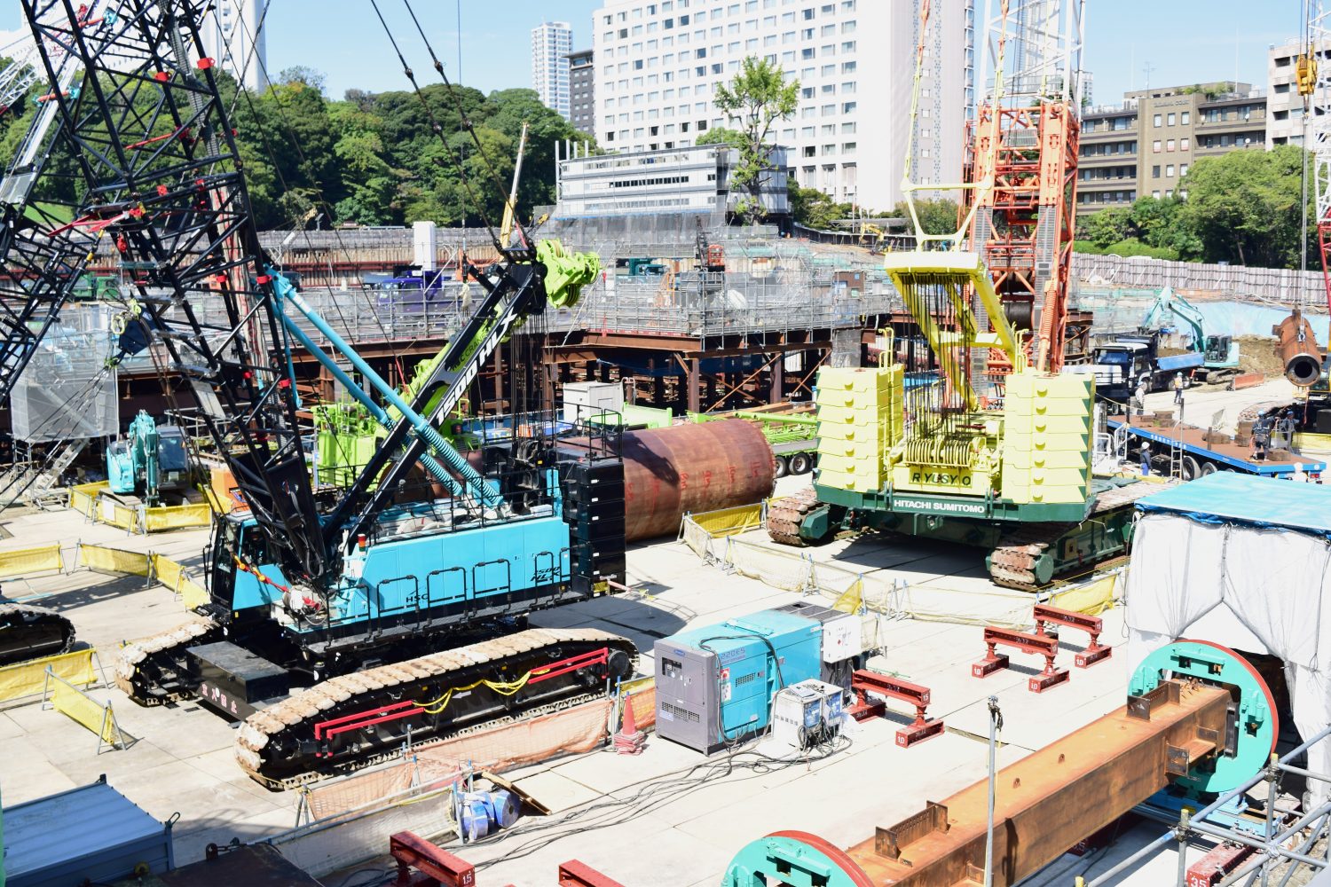 先月に引き続き、品川駅前の歩道橋から旧シナガワグース跡地を撮影しました。敷地内に置かれた鉄骨の量が7月時点より少なくなっており、ショベルカーやクレーンが活発に稼働していました。敷地の上部では複数のトラックが資材や建設機械を搬出入しており、多くの作業員によって工事が着々と進められている様子がうかがえます。