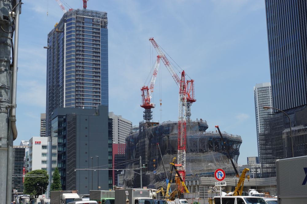 上記左側は、泉岳寺交差点から撮影した複合棟Ⅱの様子です。上層階は完成しており、残るは低層階の工事のみといった状況です。低層階には新たに3階建ての仮設オフィスのようなものが設置されており、さらなる人員の配置が予定されると考えれらます。