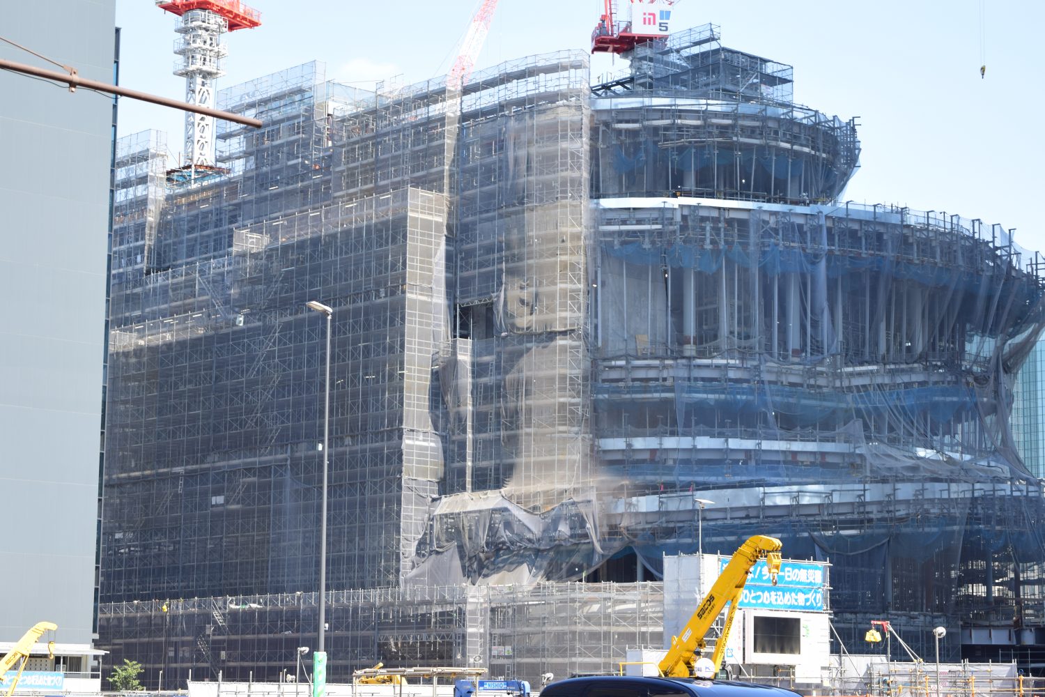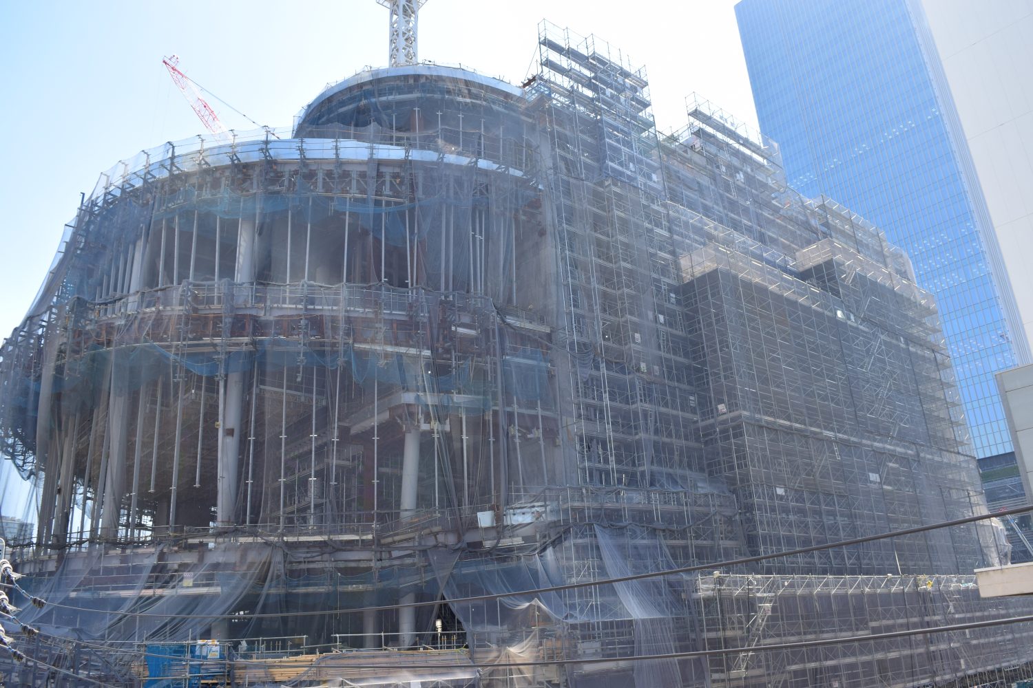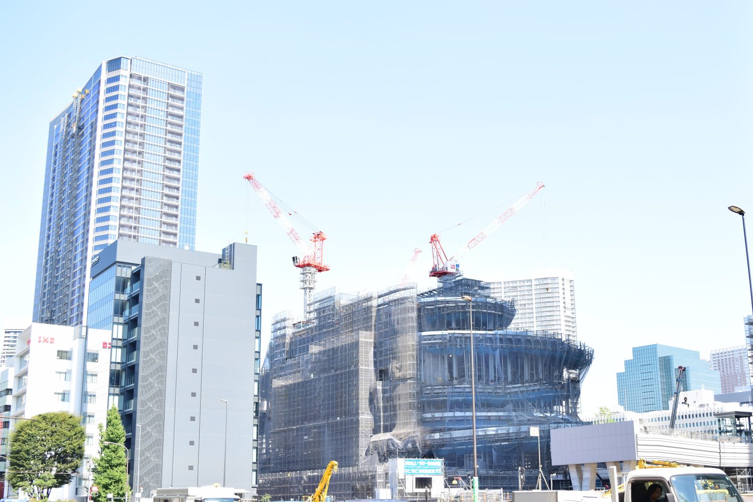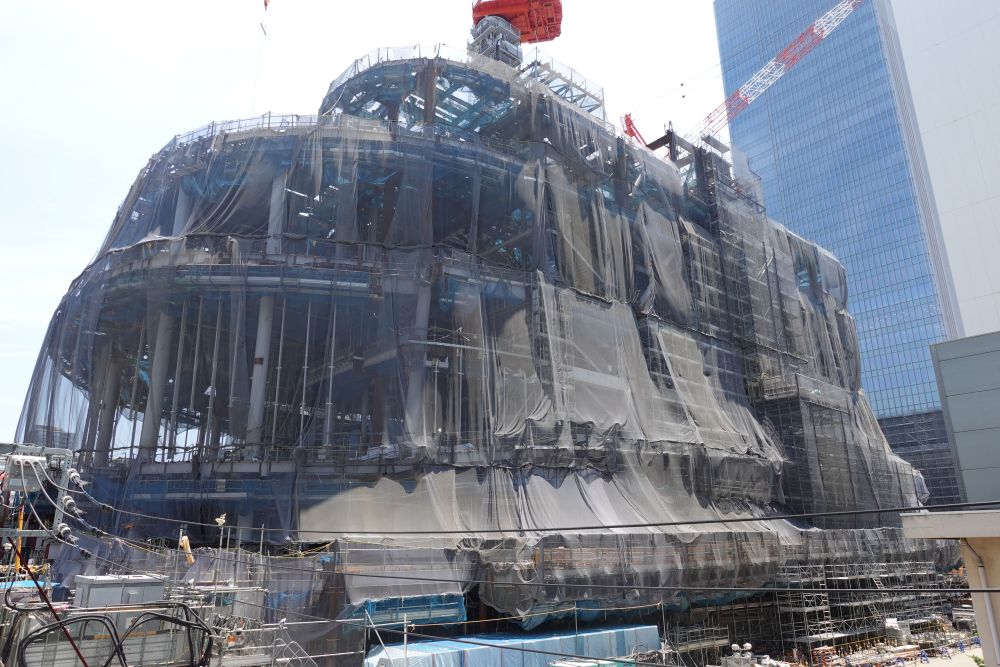 右側の写真は文化創造棟を至近距離で撮影したものです。先月の取材時と比較すると骨組みが1階分高くなり、イメージ図で描かれていたドーム状の建物の形が徐々に具体化していました。この数か月間で特に目覚ましい進展が見られたため、今回の撮影において最も注目していたポイントのひとつです。全体の形状はまだ完成していないものの、この棟が完成することにより、品川が仕事・食・ショッピングだけでなく、文化の中心地としても成長を遂げることが期待されます。完成の日が待ち遠しいですね。
