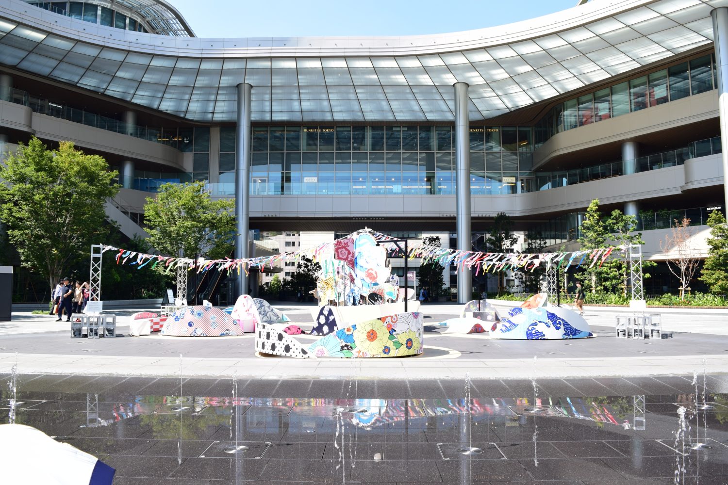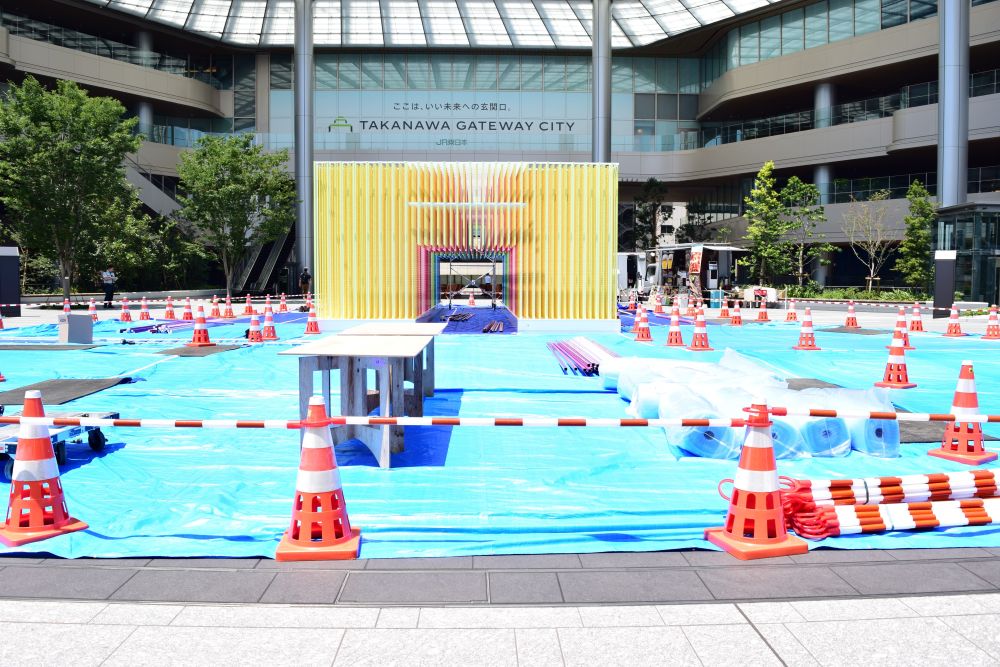 右側の写真は、JR改札を進んだ先にあるゲートウェイパークです。噴水の上にはビニールシートが敷かれており、立ち入りが禁止されている状態でした。TAKANAWA GATEWAY CITY公式の情報では、7月22日(火)から7月25日(金)の期間は工事を行っており、噴水は停止中とのことでした。Gateway Studioとあわせて、7月26日(土)よりリニューアルした姿を見られるのが楽しみですね!
