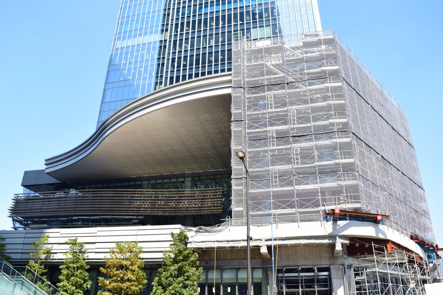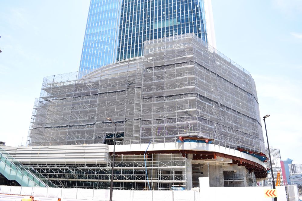 右側の写真は、複合棟ⅠNorthの下部です。エントランス部分にキャノピー(天蓋)が設置され、一気にショッピング施設の雰囲気が出てきました。今もなお工事用の鉄骨が多くみられるので、ここからさらに変化すると思うと非常に楽しみです!
