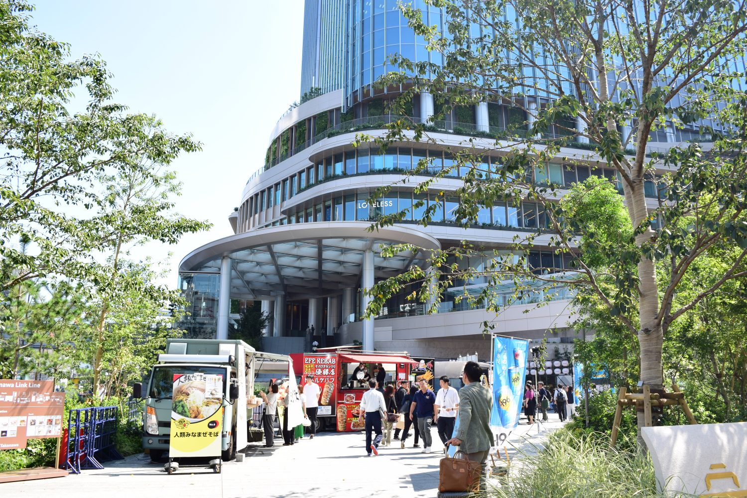 1階では「THE グルメ DAY」が開催されており、多くのフードトラックが並んでいました。本イベントは、複合棟ⅠNorthのある泉岳寺辻広場と、複合棟ⅠSouthのある高輪辻広場の2カ所で開催され、計12台のフードトラックにより多彩なグルメが提供されていました。広場には特設ステージも設けられ、多くの人で賑わいを見せていました。