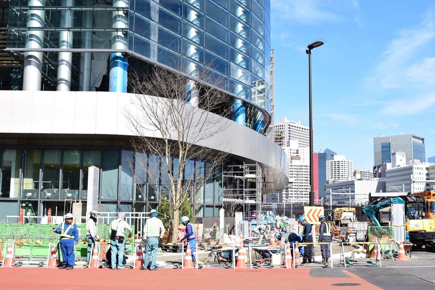 右側は、泉岳寺交差点から複合棟Ⅱを撮影したものです。先月から大きく変わった様子は見受けられませんが、先月に比べて低層階部分に多くの木々が生い茂り、緑豊かになっていました。また、写真下に見える仮設オフィスの近くを通ると、休憩中の作業員の方の姿が見受けられました。作業が大詰めになっていくことが予想されますが、事故なく無事に開業できることを願います。