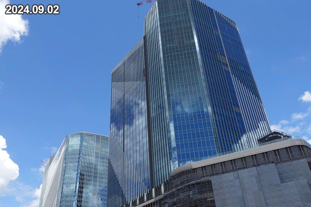 上記左側の写真は、高輪2丁目交差点から複合棟ⅠSouthを見上げて撮影したものです。今回も特に目立った変化はありませんでした。すでにビルは完成形となっているため、作業員の姿もほとんど見られません。オープンを来月に控え、駐車場案内などの設置が進められており、商業施設がまもなく動き出す雰囲気が漂っています。