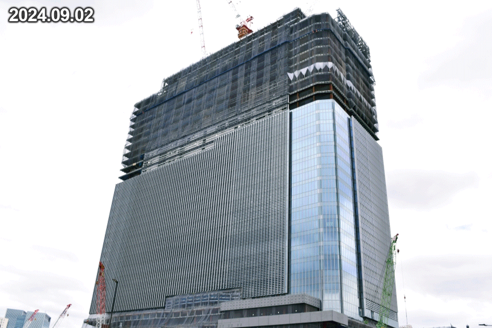 上記左側の写真は、高輪2丁目交差点から見上げて撮影した複合棟ⅠSouthです。約40日ぶりの撮影となりましたが、完成形に最も近い建物ということもあり、高層階には特に大きな変化は見られませんでした。