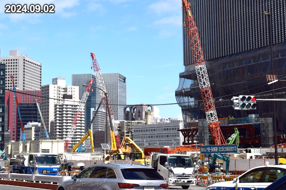 中央の写真は、高輪2丁目交差点に移動して撮影した複合棟ⅠSouthです。すでに建物は完成しているので、前回と比べて目立った変化はありませんでした。工事の動きは見られなかったものの、交差点を渡ってビルの中へ向かう人たちが多く見られました。今後、周辺の開発が進めば、さらに多くの人が集まる賑やかな交流の場になりそうですね!