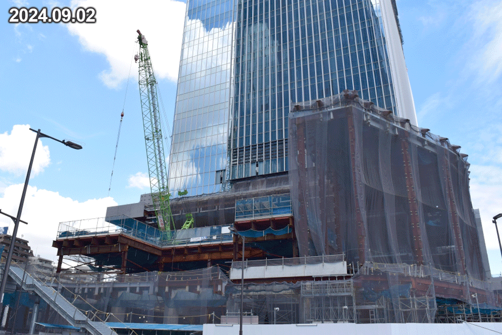 上記左側は、補助線街路第322号線から複合棟Ⅱを見上げた写真です。鉄骨の量が大幅に増え、前回と比較しても大きな変化が見られます!「TAKANAWA GATEWAY CITY」は全体として、建物の角がなく、丸みを帯びた形状が非常に印象的です。この低層階にも、曲線を活かしたショッピング街が形成されるのではないかと予想されます。