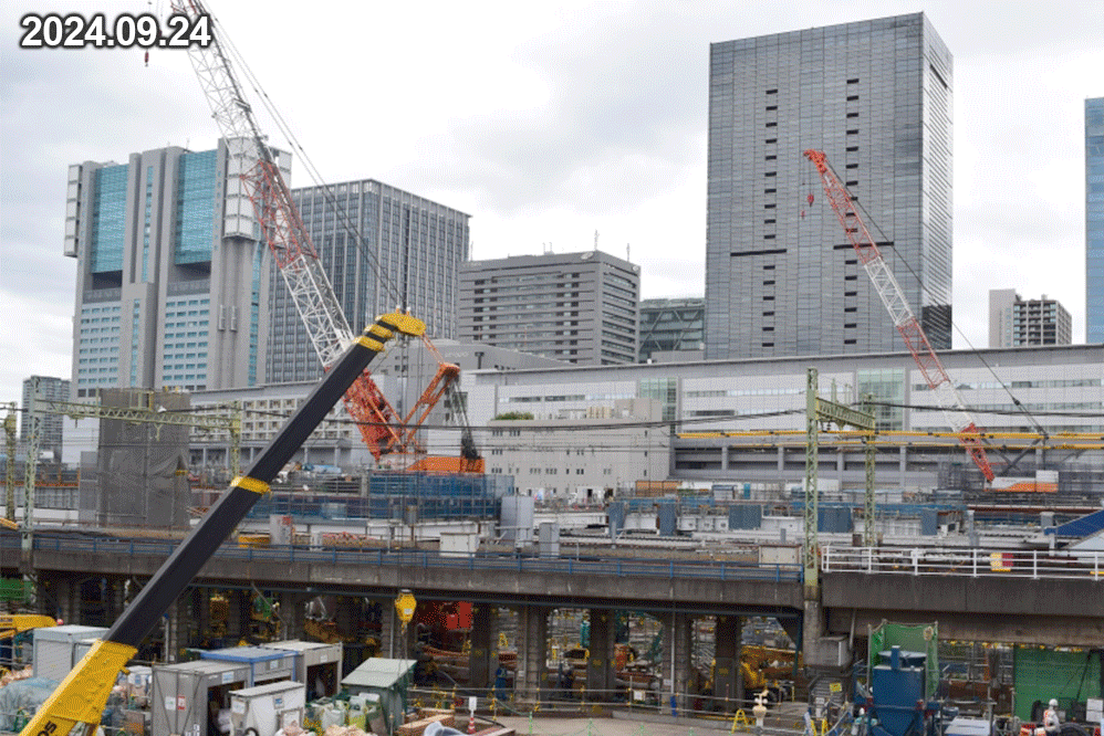 右側は、同じく歩道橋から、品川駅の大崎方面を望んで撮影した写真です。こちらは7月から大きな変化が見られませんでした。建物上部にある建設機械の種類や配置にも変化がないため、現在は内部の工事が進められていると考えられます。