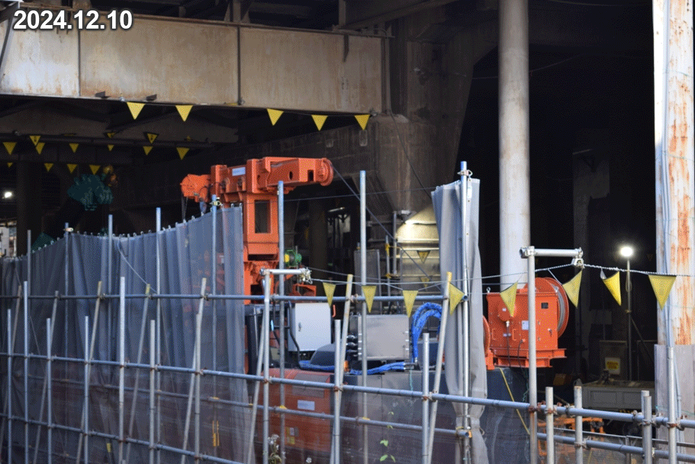 中央の写真では、広告がかけられている柱の裏にも多くの重機が見え、工事を進めている様子が伝わってきます。撮影のたびに、こちらで作業している方も増えているように感じます。
