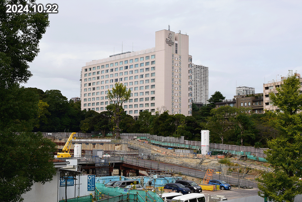 上記の写真は、品川駅前の歩道橋から同じ画角で旧シナガワグース跡地を撮影したものです。 三方向に分岐していた歩道橋のうち、2025年11月時点では通行止めとなっていた、品川駅からシナガワグース方面へ通じる部分のみが撤去されていました。前回はタンクが2つ並んでいましたが、それらが撤去され、全体的に重機の数も減っていたことから、取り壊しが完了したことがうかがえます。
