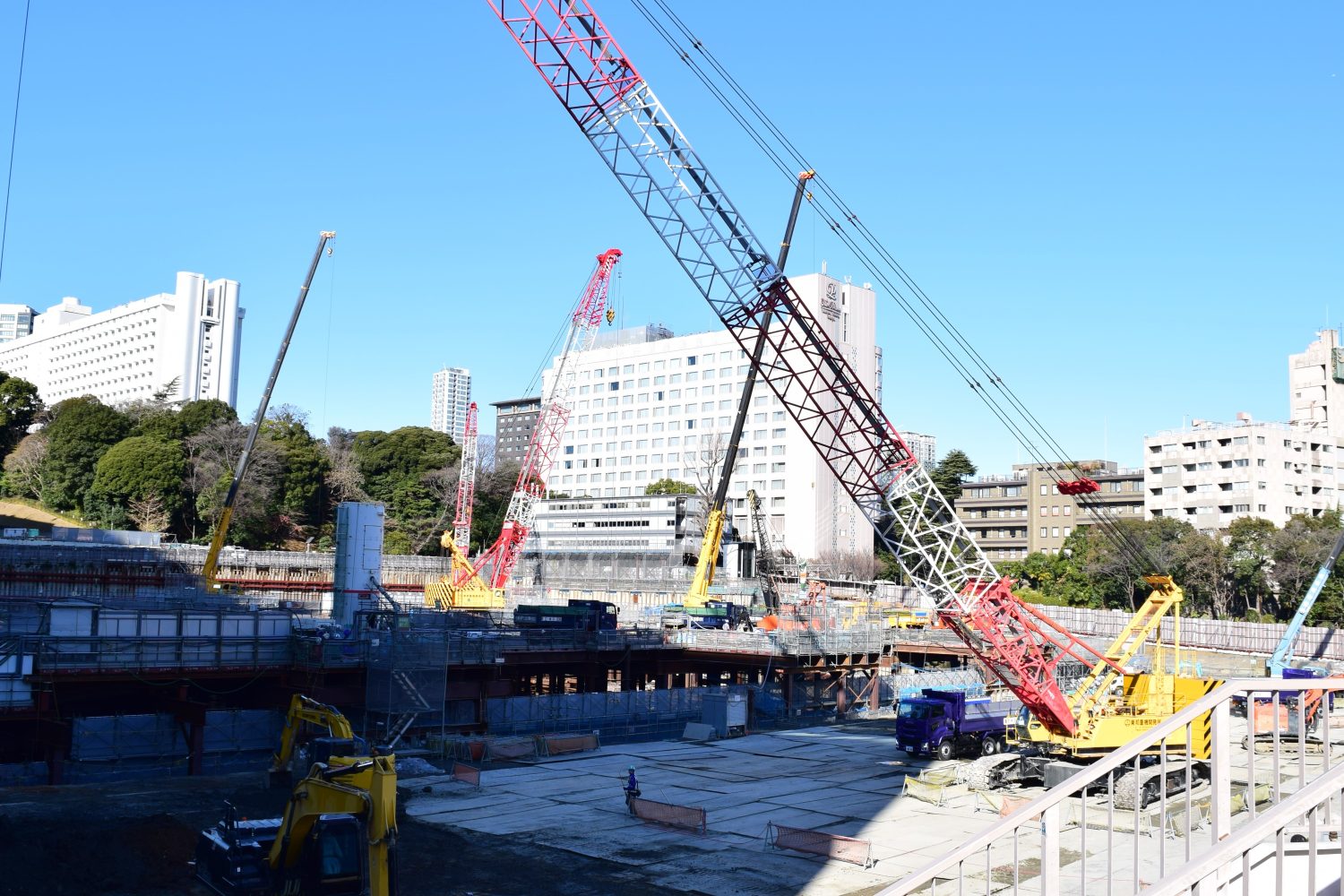 こちらの写真は、旧シナガワグース跡地のA地区にあたります。A地区では地下4階、地上29階建てのビルが建設される予定です。建設に向けた準備として、地面の砂をならして板を敷くといった整備が進められている様子が確認できました。