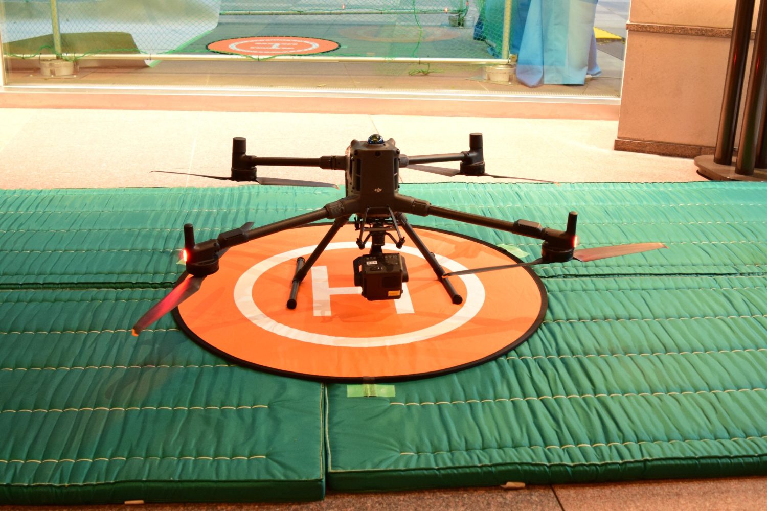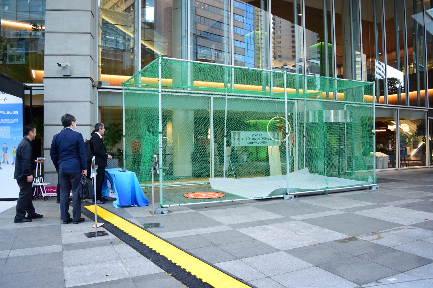 同ブースの室内では、大型ドローンの実演も行われていました。現在、ドローンは建物の外壁検査や物流支援などに活用されています。担当者の協力により、間近で撮影することができました。