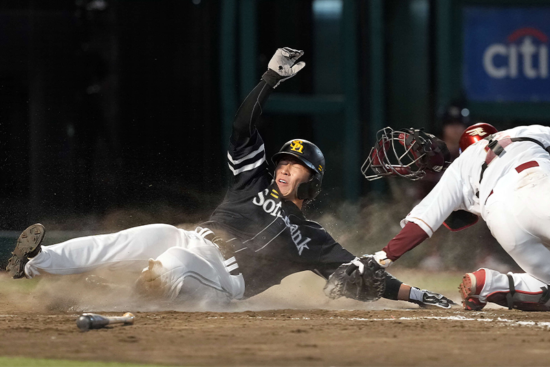 初戦、オリックス戦とは打って変わって打線が好調なソフトバンクは、2回表までに3点を先取します。4回表には、9番・川瀬晃選手による2打席連続のタイムリーヒットが会場を沸かせます。楽天は5回裏、8番・太田光選手によるタイムリーヒットで1点を返しますが、勢いに乗り切れず。