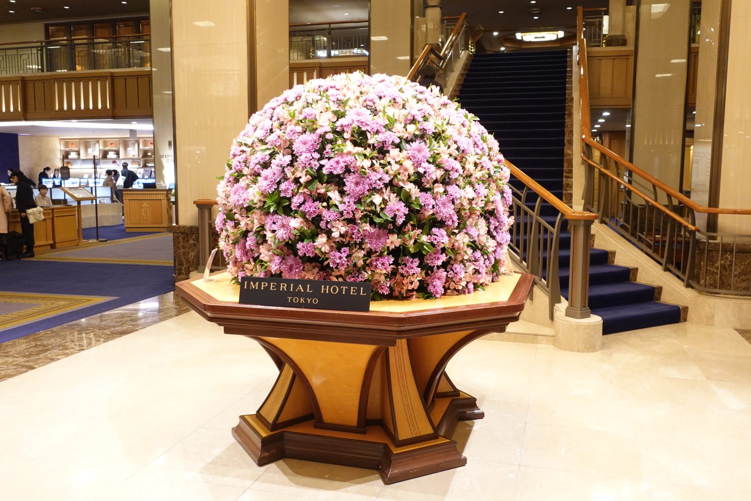 歓迎会の会場となったのは、東京・日比谷に位置する歴史ある帝国ホテルです。正面玄関から入ると、ロビー中央に設えられた装花が目に入ります。ロビー装花は、季節ごとに内容が変わり四季折々の表情を見せています。アナスタシアやスプレーマム、アルストロメリアなどの春らしい桃色の花々が調和し、空間に華やかさと奥行きをもたらしていました。