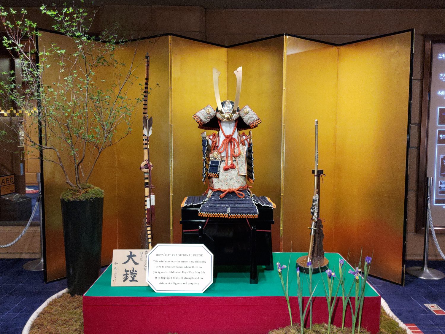ロビー中央の階段を上ると、五月人形が展示されていました。端午の節句を祝う鎧飾りが凛とした存在感を放ち、行き交う人の足を止めていました。周囲には太刀や弓矢、屏風が配置され、日本文化のおもてなしを感じられる空間となっていました。