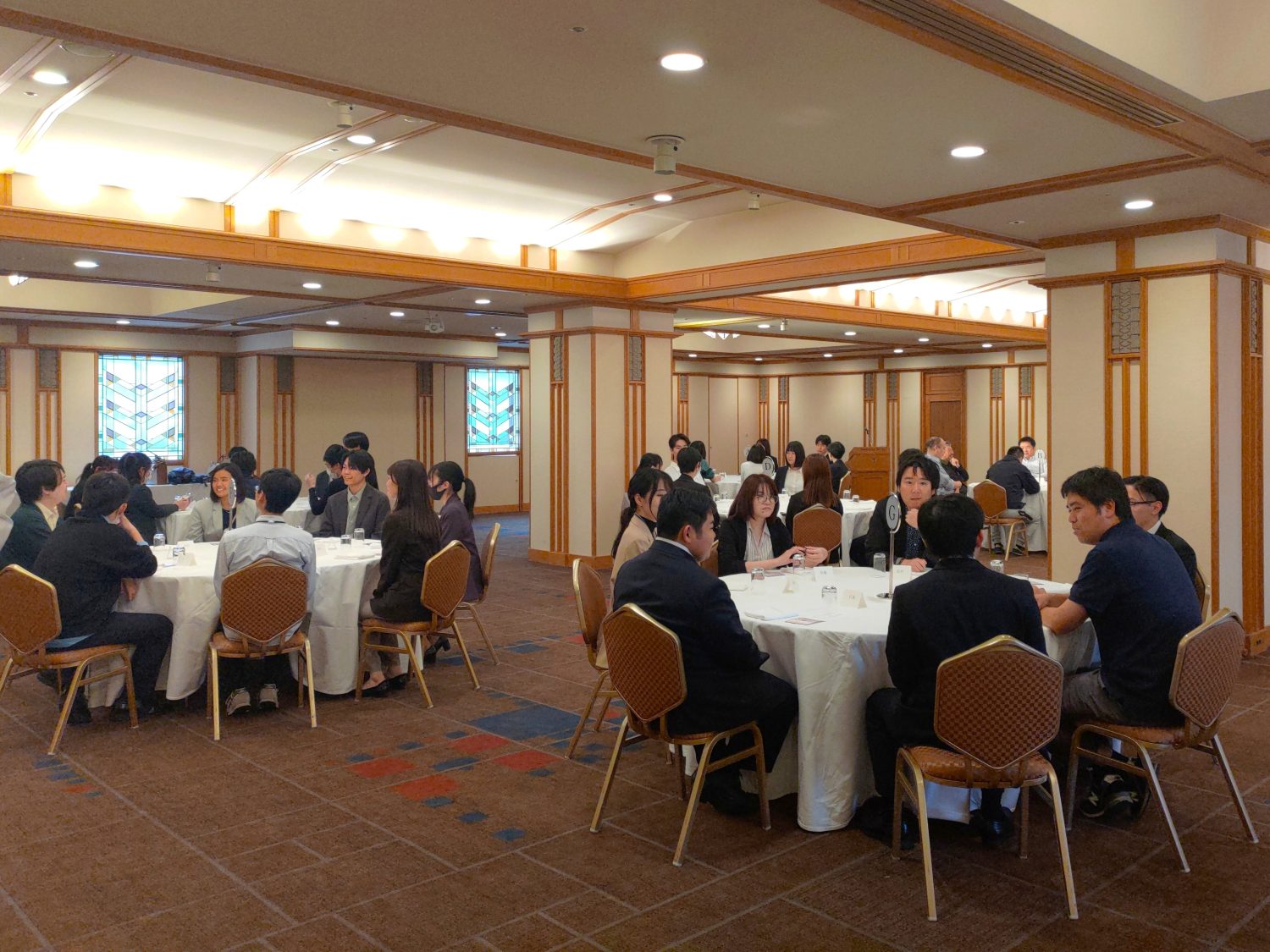 今回の会場である「孔雀 南の間」は帝国ホテルを代表するバンケットルームです。国際会議や学術会議にも利用されてきた格式ある空間となっています。受付前では談笑を楽しむ社員や、記念に写真を収める姿が見られました。座席は部署の垣根を越えたランダムな配置とされ、新入社員も交えた清新な顔ぶれが並びました。