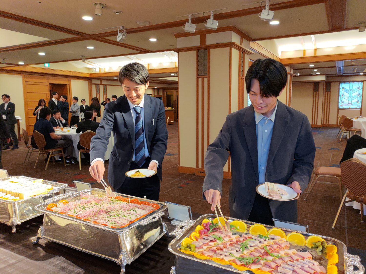 乾杯の後は会食の時間です。ビュッフェテーブルには彩り豊かなメニューが並びました。シーフードのカクテルや蒸し鶏の冷製などの前菜が目を引きます。メインにはパスタグラタンや国産豚のローストブーランジェールが並び、満足感のある内容でした。帝国ホテル伝統のカレーは、早い段階で提供が終了するほど人気を集めていました。料理を楽しみながら、各テーブルで会話が広がります。部署や世代を越えた交流が進み、自然とコミュニケーションが生まれていました。